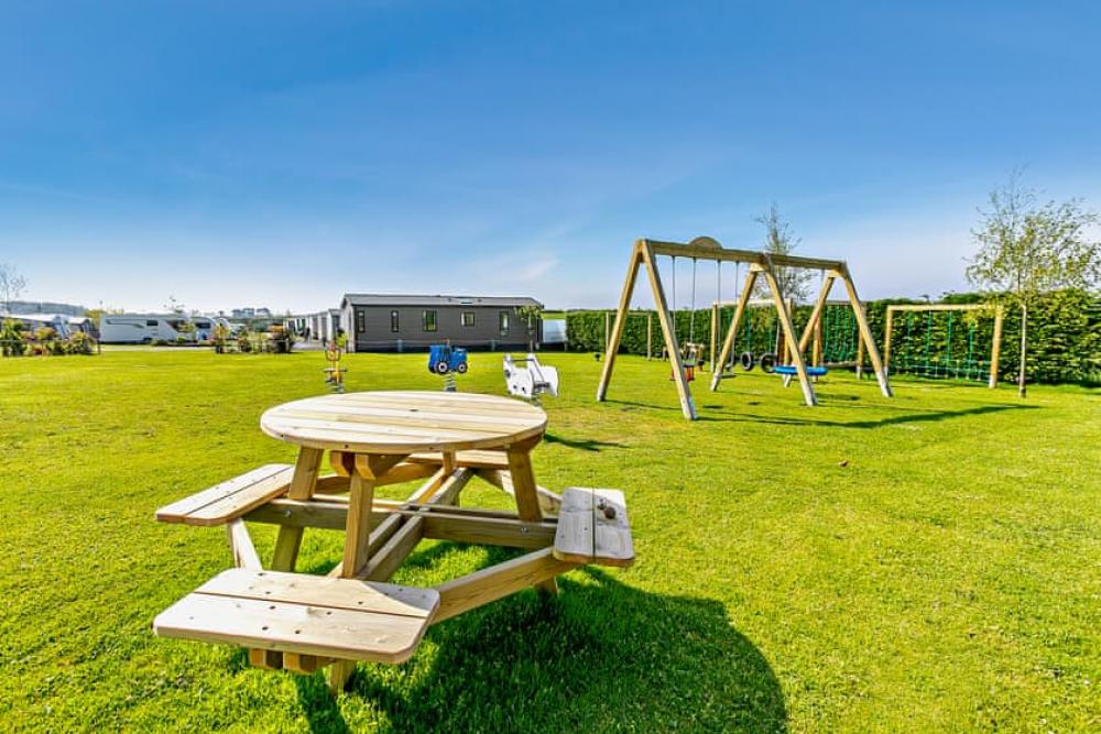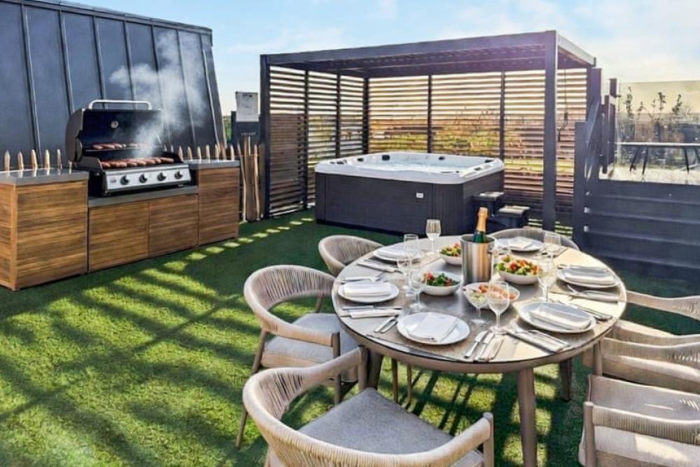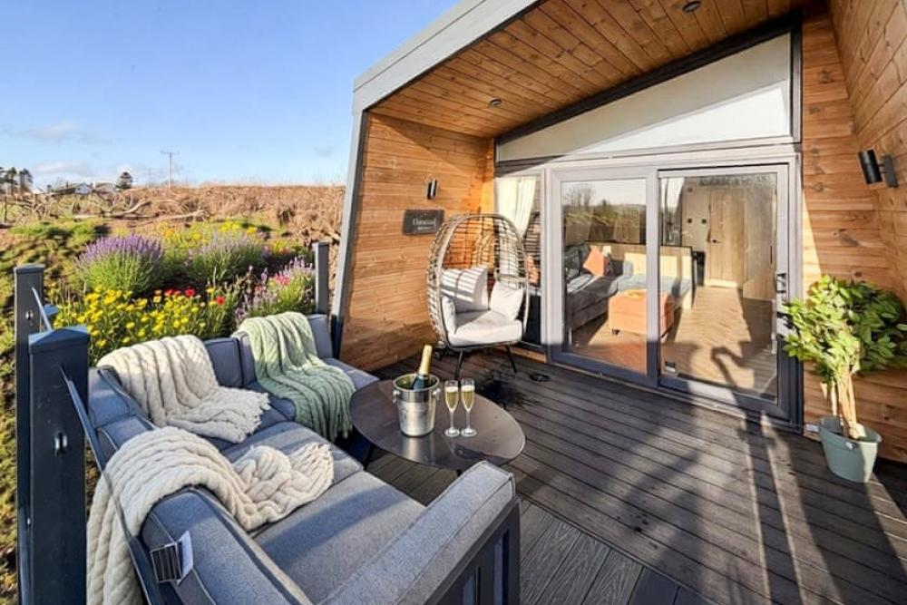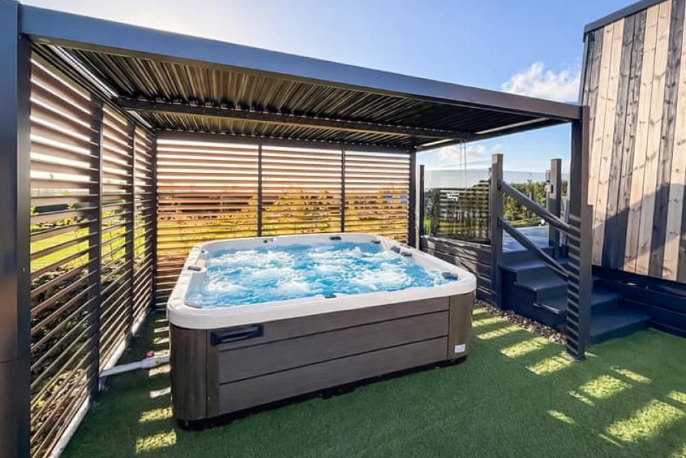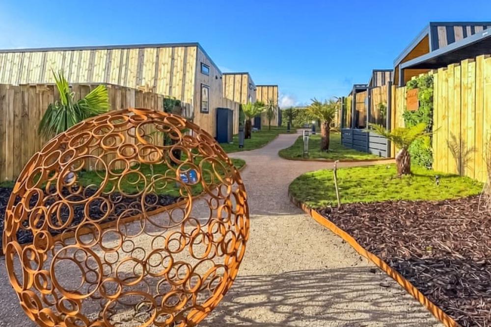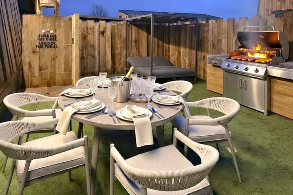 A stylish luxury lodge retreat with private spa garden, hot tub and outdoor kitchen near the charming Cornish coast.